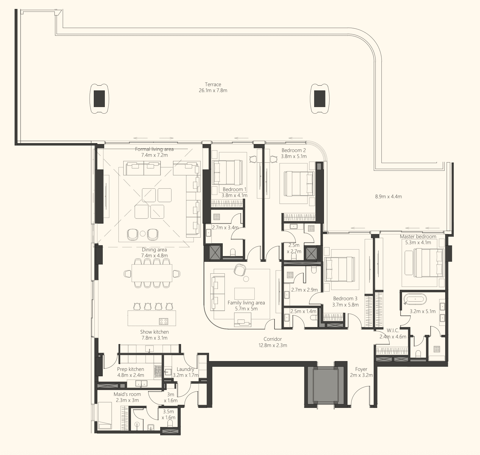- 4 Bedroom Simplex | 5 Bathrooms | 4 Parking Spaces Residence Terrace 4,521 sq. ft. 2,831 sq. ft. 420 sq. m. 263 sq. m. Total 7,352 sq. ft. 683 sq. m.
